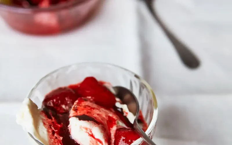 Yaourt fouetté aux fraises rôties et sauce au fudge aux cacahuètes