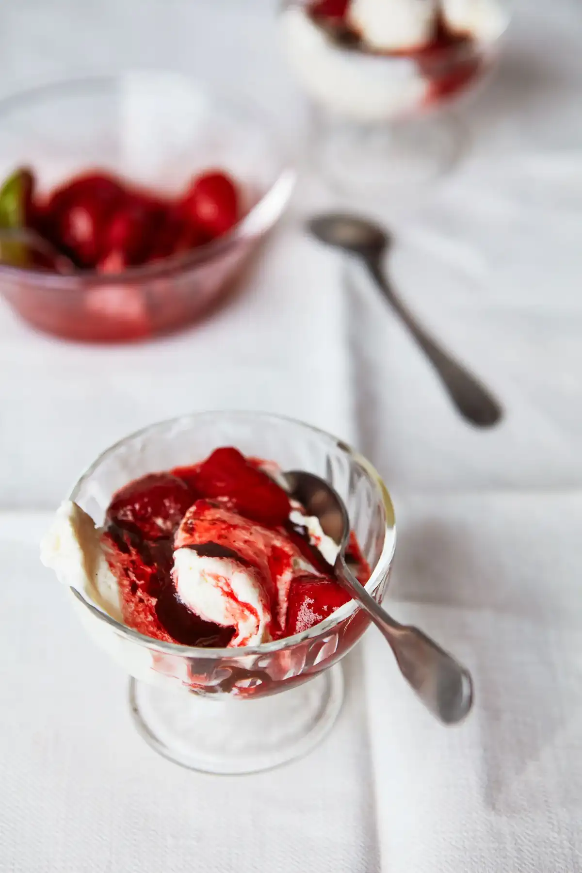 Pour servir, sortez le parfait du congélateur et sortez-le du moule à l’aide du film alimentaire. Déballez et coupez en huit tranches, en mettant une sur chaque assiette. Servir la compote à côté.
